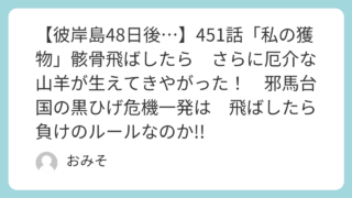 彼岸島 【彼岸島48日後…】451話「私の獲物」骸骨飛ばしたら さらに厄介な山羊が生えてきやがった! 邪馬台国の黒ひげ危機一発は 飛ばしたら負けのルールなのか!! 週刊ヤングマガジン2025年34号掲載。作者は松本光司先生。これ以上ネタバレに手を出したら許さない 2025.07.22 彼岸島