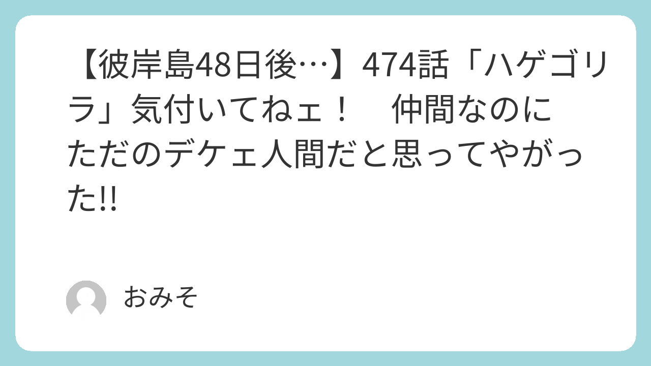 ンで この後、仁たちを明たちに紹介する流れになると思うが…ク◯二のことはどう紹介すんだァ? 「見るからに」だけじゃなく、あだ名も下品の化け物じゃねェか!