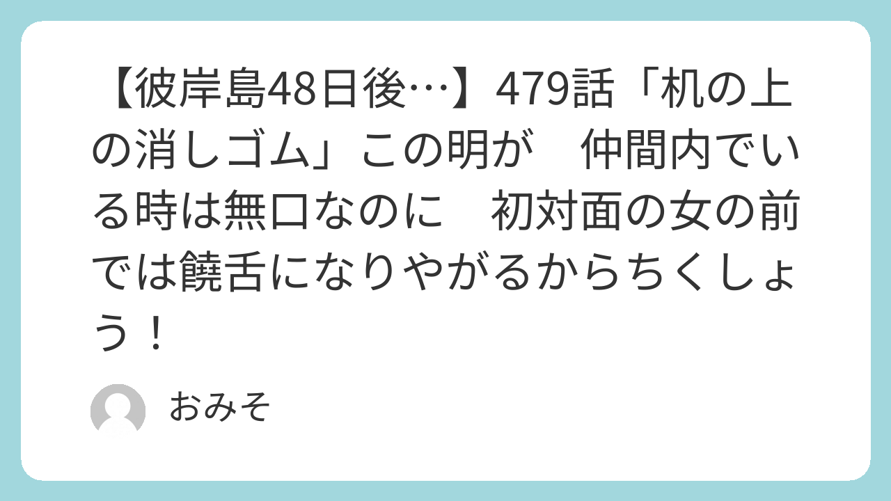 「はじめまして」だと思っちまっているのに「以前、どこかで会いましたか?」というのは定番のナンパテク! 化粧はしていないし怪我だらけなのに 女友達を複数見せて「ほらほら、ライバルは多いよ。他の女に取られちまう前に早くお前から迫ってこいよ」と焦らせる! 自分の所に人が集まってくるところを見せる事で、俺は皆から憧れる存在だぞと、ブランドに弱ェ女の弱点を突く! 自衛官と対等に今後の話を出来るほどの重要人物だぞとさりげなくアピール! 押す一辺倒だけでなく「大友さん」と苗字呼びしちまったり、自衛隊が守ってれるから安全だと「自分が守るわけではない。…今は、ね」という、ここでは一旦引いておくという駆け引きも使いやがった! 蘭華を勝次の隣の病室に入れることで、子供が寝言に出すまで明に懐いているという、将来良いパパになりますよと優良物件アピール!